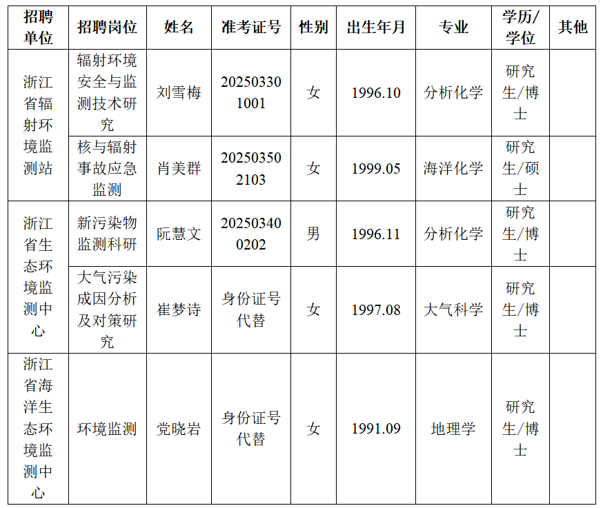 根据2025年10月27日《浙江省生态环境厅关于部分直属事业单位公开招聘人员的公告(2025年第四批)》,经报名、资格审查、考试、体检和考察,现分别确定下列人员为我厅所属部分事业单位拟聘用人员,公示如下: